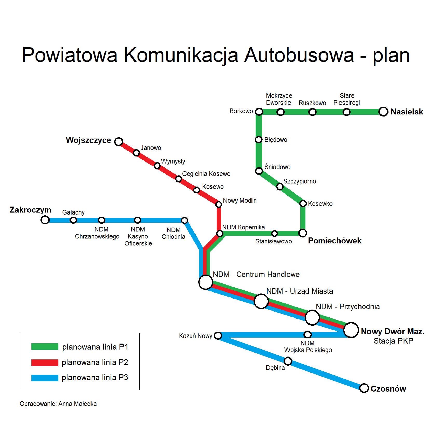 Jeśli procedury zakończą się zgodnie z planem, Powiatowa Komunikacja Autobusowa w powiecie nowodworskim ma ruszyć 1 kwietnia 2026 roku. Władze powiatu zachęcają mieszkańców do zapoznania się ze schematem planowanych linii, który pokazuje przebieg tras i lokalizację przystanków.