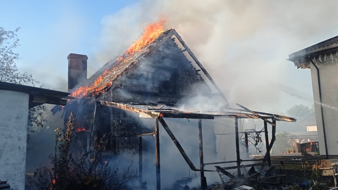 Po przybyciu na miejsce pierwszych zastępów, zastano rozwinięty pożar budynku murowanego z ociepleniem styropianowym i drewnianym dachem pokrytym blachą. Pożar rozwinięty był zarówno na poddaszu jak i w środku budynku. Tuż obok zagrożony był budynek mieszkalny na którym doszło do stopienia się podbitki styropianowej oraz uszkodzeniu okien. Z wnętrza płonącego budynku strażacy wynieśli butlę propan – butan. Podano 2 prądy wody w natarciu na płomienie oraz jeden w obronie sąsiedniego budynku.