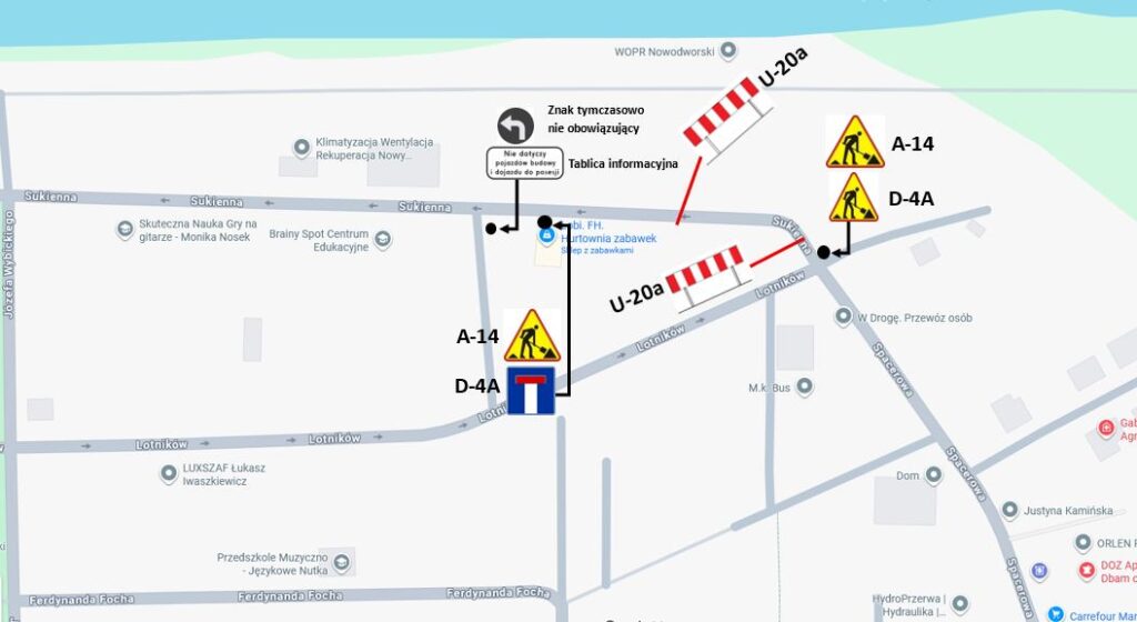 Zamknięcie obejmie odcinek ul. Sukiennej od skrzyżowania z ulicami Lotników i Spacerową do posesji przy ul. Sukiennej 20A. Prace rozpoczną się 30 marca o godz. 7:00 i potrwają do 31 marca do godz. 19:00.