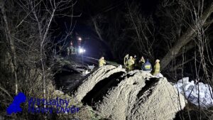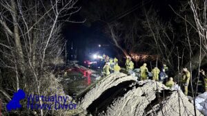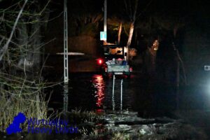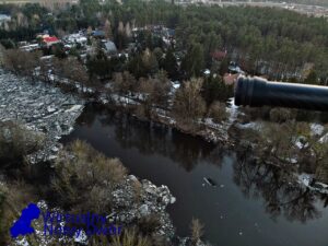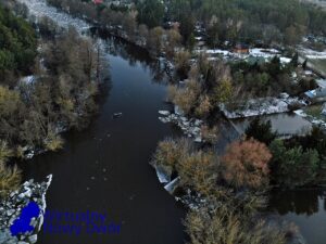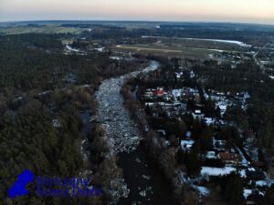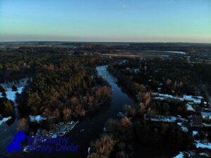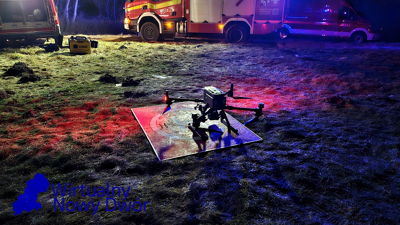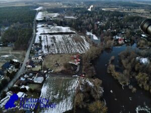 Wsparcie z powietrza zapewnia OSP Ratownictwo Wodne, która przy użyciu drona obserwuje rozwój sytuacji oraz pomaga w ocenie zagrożenia na szerszym obszarze.