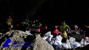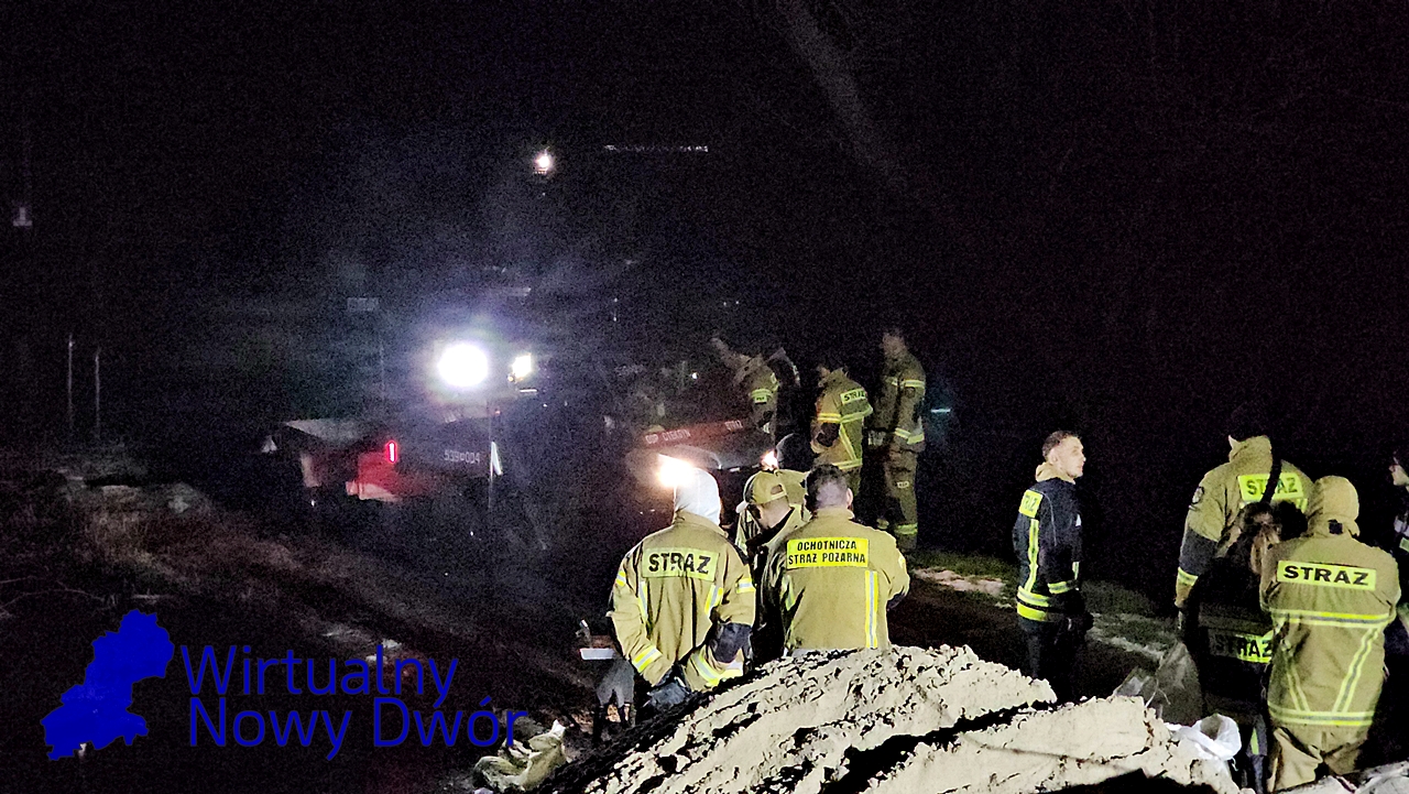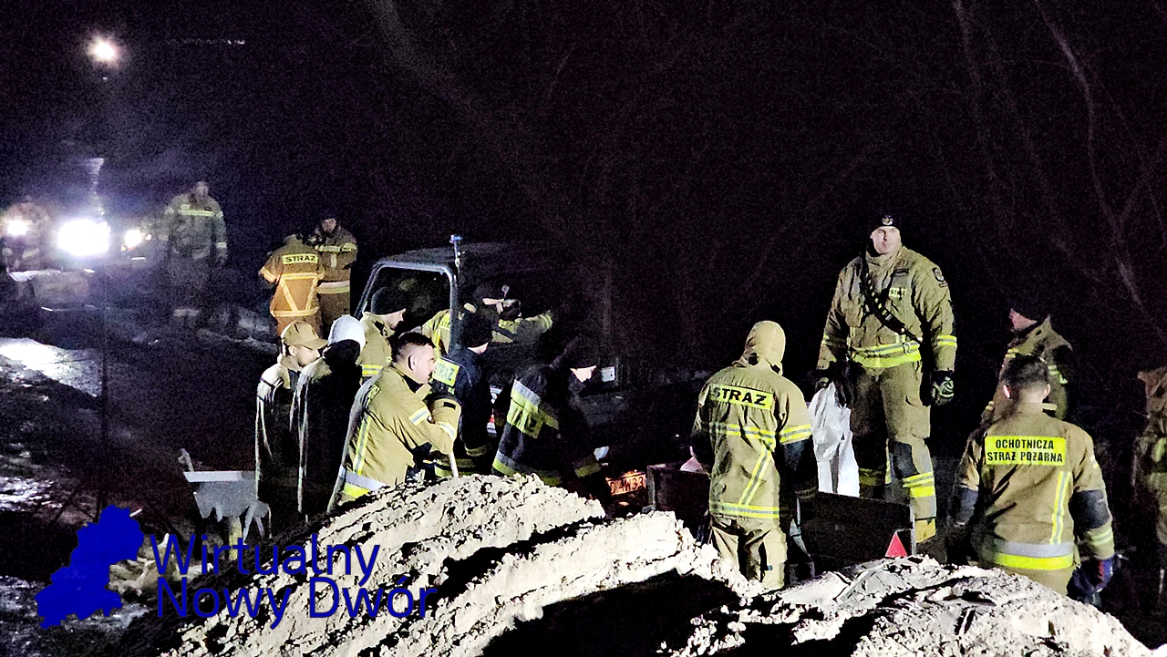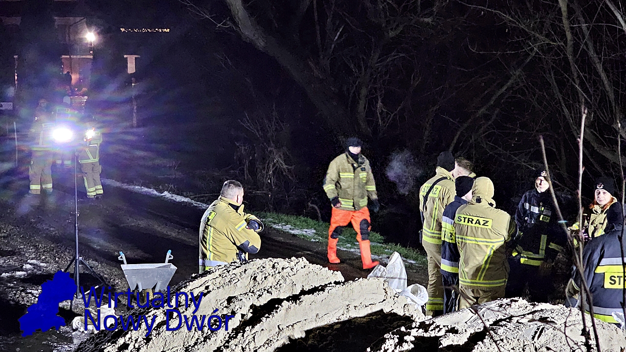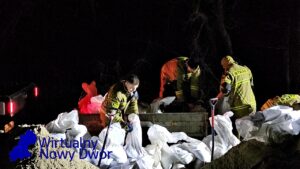 Strażacy układają worki z piaskiem, starając się ograniczyć rozlewisko i zabezpieczyć zagrożone budynki przed dalszym napływem wody. Sytuacja jest dynamiczna i wymaga stałego monitorowania.