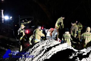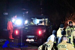 Teren prowadzonych działań zabezpieczają funkcjonariusze, dbając o bezpieczeństwo mieszkańców oraz sprawny przebieg akcji ratowniczej.
