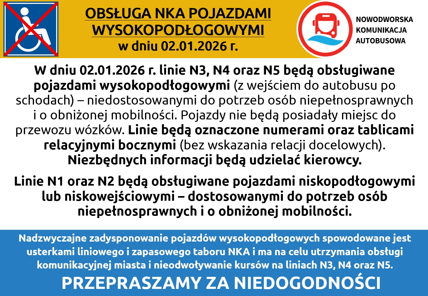 W piątek, 2 stycznia 2026 r., pasażerowie Nowodworskiej Komunikacji Autobusowej muszą liczyć się z istotnymi zmianami w obsłudze części linii. Dotyczą one przede wszystkim dostępności pojazdów dla osób z niepełnosprawnościami oraz systemu informacji pasażerskiej.